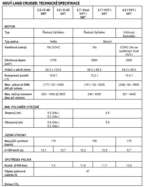 Ve spojení se šestistupňovou manuální převodovkou pak Land Cruiser 2,8 litru D-4D vyvine nejvyšší točivý moment 420 Nm v pásmu 1 400 až 2 600 ot/min. Zrychluje z 0 na 100 km/h za 12,1 s, a rozjede se až na 175 km/h, zde při kombinované spotřebě paliva 7,4 l/100 km a emisích CO2 na úrovni 194 g/km.
