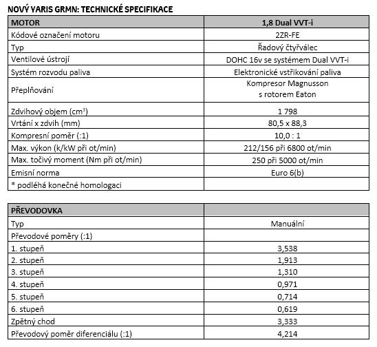 Výkonnostní zaměření modelu dokládají lehká 17" kola, větší brzdy, středová oválná koncovka výfuku a specifické provedení exteriéru odkazující na závodní tým Toyota GAZOO Racing, oblékající bílou, černou a červenou barevnou kombinaci. Pod kapotou se nachází jednotka 1,8 litru naladěná na výkon 212 koní podpořený kompresorem, který je v rámci výkonných malých hatchbacků (segment B) jedinečný.