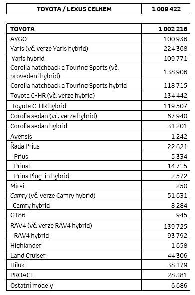 • Nejúspěšnější hybridní modely: Toyota C-HR hybrid (119 507); Corolla hatchback a Touring Sports (118 715); Yaris hybrid (109 771); RAV4 (93 792)