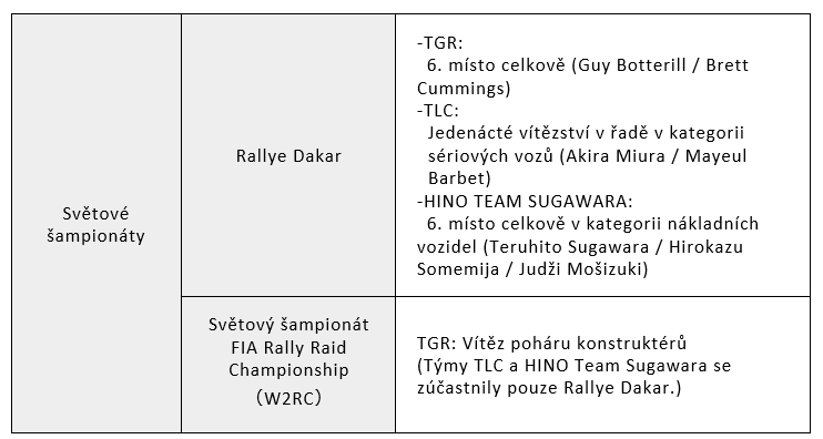 Úsilí TOYOTY GAZOO Racing na Dakarské rallye 2025 podpoří i Team Land Cruiser Toyota Auto Body (TLC) v kategorii T2 (produkční vozy s povinnými úpravami) se dvěma rallyovými vozy na základech modelu Land Cruiser 300 GR SPORT, resp. tým HINO TEAM SUGAWARA s jedním vozem na základech modelu HINO 600 Series.