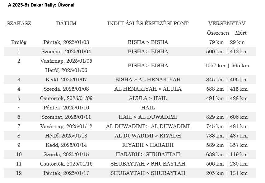 A verseny összesen 12 szakaszt foglal magában, a szakaszok hossza a 134 kilométeres, rövid, de megerőltető utolsó naptól a 606 kilométeres 6. szakaszig terjed. A január 10-i pihenőnap Hailban rövid szusszanást biztosít, de rögtön utána folytatódik az intenzív megmérettetés, amikor a versenyzők a második héten a leghosszabb időmérő szakaszokkal és a kihívást jelentő dűnékkel állnak majd szemben. A rally január 17-én Shubaytahban ér véget, ahol a sikeres célba érkezőkre ünnepi dobogó vár.