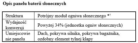 * Maksymalne ładowanie, generowane przez system solarny podczas parkowania lub jazdy, przeliczone na zasięg podróżny, zgodnie z japońskim cyklem testowym JC08. Obliczono na podstawie wytycznych Japońskiego Stowarzyszenia Energetycznego (FY2016), uwzględniając straty poniesione w systemach pokładowych. Ilość promieniowania słonecznego obliczona na podstawie dziennych danych, pochodzących z lat 1990-2009 w okręgu Nagoya, uśrednionych do skali jednego roku (źródło: NEDO).
