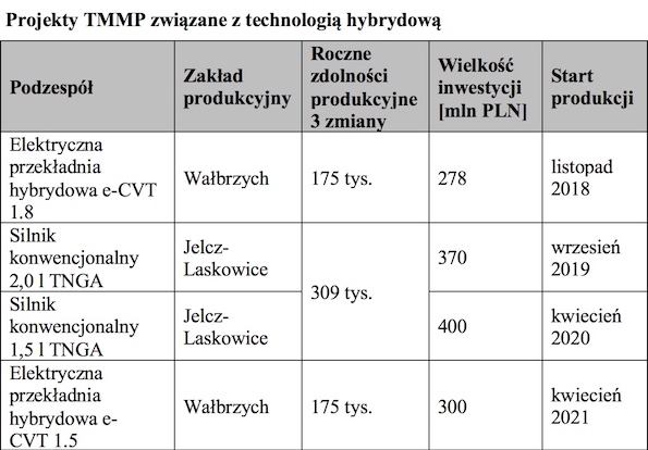 Razem z obecnie realizowanymi projektami poziom inwestycji w obu zakładach Toyota Motor Manufacturing Poland zlokalizowanych w Wałbrzychu i Jelczu-Laskowicach wzrośnie do blisko 5 miliardów złotych.