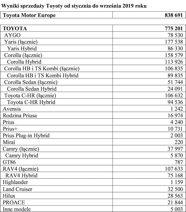 Europejscy klienci kupili w tym roku 775 201 samochodów marki Toyota, o 2,6% więcej niż w ciągu pierwszych 9 miesięcy 2018 roku. Najpopularniejszy model to Yaris – na drogi wyjechało 177 538 egzemplarzy miejskiego hatchbacka w omawianym okresie. Drugie miejsce zajęła Corolla z wynikiem 158 579 egzemplarzy, a trzecie Toyota RAV4 notująca 107 633 sprzedanych aut. Największymi wzrostami wykazały się modele Mirai (+76%), Camry (+30%) i RAV4 (+24%).