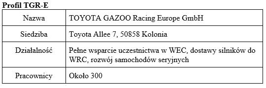 Toyota Motor Corporation (Toyota) ogłosiła, że firma TOYOTA Motorsport GmbH (TMG) formalnie zmieniła nazwę i będzie teraz działać pod marką TOYOTA GAZOO Racing Europe GmbH (TGR-E). Siedzibą przedsiębiorstwa nadal będzie Kolonia.