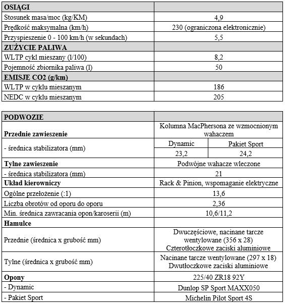 - Przyspieszenie od 0 do 100 km/h w 5,5 sekundy, prędkość maksymalna ograniczona elektronicznie do 230 km/h