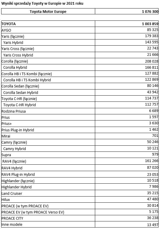 - Sprzedaż Toyota Motor Europe w 2021 roku wyniosła 1 076 300 samochodów