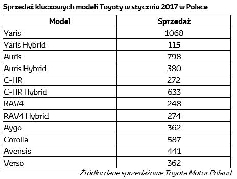 Toyota sprzedała w styczniu rekordową liczbę samochodów. W pierwszym miesiącu roku z salonów marki wyjechało 5651 aut. Najpopularniejszymi modelami były miejski Yaris (1183 egz.), kompaktowy Auris (1178 egz.) i nowy crossover C-HR.
