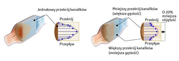 Optymalne natężenie przepływu gazów przez kanaliki katalizatora powoduje efektywny przebieg reakcji katalitycznych i skuteczne oczyszczanie spalin. Jednak w przypadku konwencjonalnych podłoży, w których wszystkie kanaliki mają taki sam przekrój, rozkład natężeń przepływu gazów nie jest równomierny. Przez środkową część przepływa większa ilość spalin i mają one większą prędkość, w związku z tym dla ich oczyszczenia potrzebna jest tam większa ilość metali szlachetnych. Jednak przy obecnej technologii ilość substancji nanoszonych na podłoże musi być w każdym miejscu taka sama, więc gdy w części środkowej ilość substancji katalitycznej jest optymalna, w miejscach o słabszym przepływie katalizator nie jest efektywnie wykorzystany. Zapewnienie równomiernego rozkładu natężeń przepływów poprzez stosowny dobór przekroju i gęstości kanalików pozwala wyeliminować ten problem.