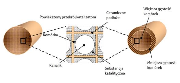 Obecnie najczęściej stosowanym podłożem katalizatorów spalin silników benzynowych jest materiał ceramiczny (kordieryt), ukształtowany w strukturę podobną do plastra miodu, z wielką liczbą podłużnych kanalików o przekroju sześciokątnym lub kwadratowym. Na ścianki kanalików naniesiona jest substancja katalityczna, taka jak platyna (Pt), rod (Rh), pallad (Pd) czy inne metale szlachetne. Ich obecność powoduje w wysokiej temperaturze reakcje katalityczne, w których szkodliwe gazy, takie jak tlenek węgla (CO) i niedopalone węglowodory (HC), są utleniane do dwutlenku węgla i wody, a tlenki azotu (NOx) są redukowane do nieszkodliwego azotu.