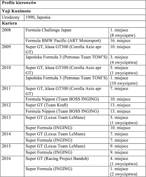 26-letni Yuji Kunimoto ma bogate doświadczenie w wyścigach długodystansowych po 8 sezonach w serii Super GT. W ubiegłym roku kierowca pokonał wielu słynnych zawodników, wygrywając japońskie mistrzostwa Super Formula, przy jednoczesnym udziale w serii Super GT.