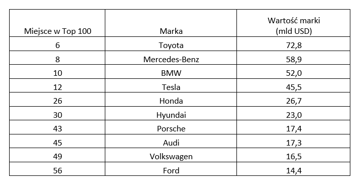 Najbardziej wartościowe marki motoryzacyjne według raportu Best Global Brands 2024 firmy Interbrand