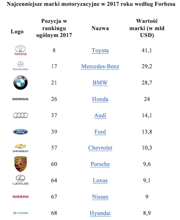 Ranking magazynu Forbes potwierdził, że Toyota należy do ścisłej czołówki najcenniejszych globalnych marek, obok takich technologicznych gigantów jak Apple, Google, Microsoft czy Facebook. Japońska marka zajmuje w tym roku z 8. pozycję.