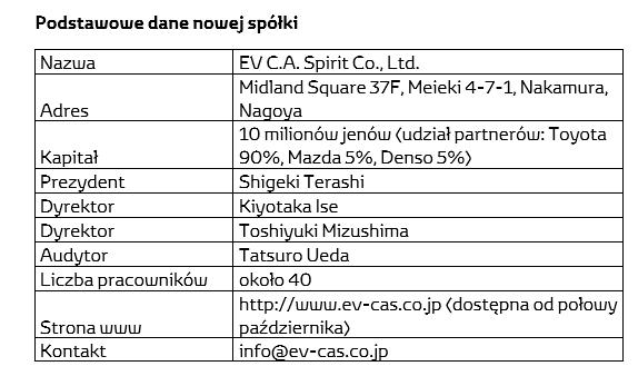 Toyota, Mazda i Denso podpisały umowę dotyczącą wspólnego opracowania modułowych technologii dla samochodów elektrycznych. Partnerzy powołają do tego celu nową spółkę o nazwie EV C.A. Spirit, w której znajdą zatrudnienie wybrani inżynierowie z każdego z trzech przedsiębiorstw.