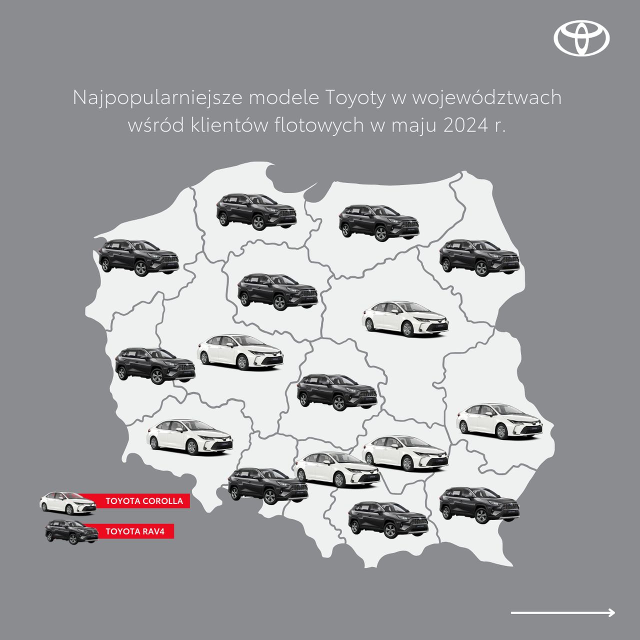 W maju firmy zarejestrowały 5491 aut Toyoty, a Corolla była najpopularniejszym autem marki w sześciu województwach – dolnośląskim, lubelskim, mazowieckim, śląskim, świętokrzyskim, wielkopolskim. W pozostałych 10 regionach triumfował model RAV4.