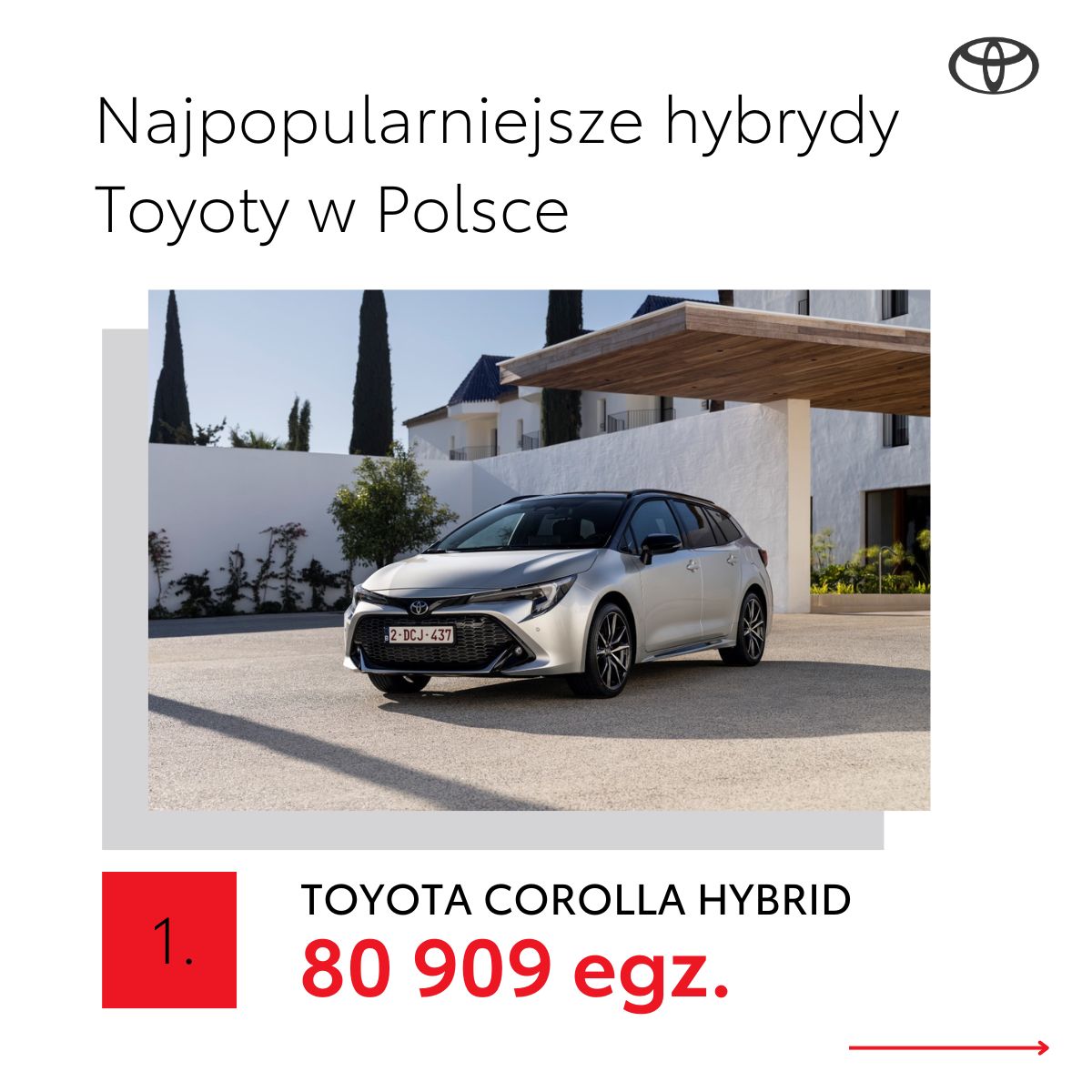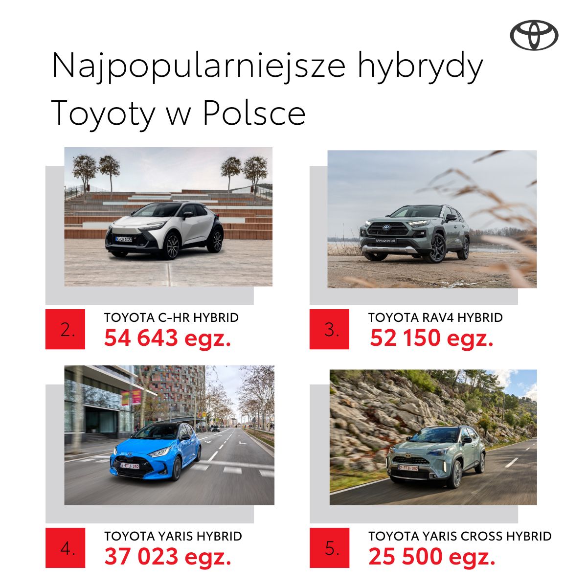 Samochody Toyoty z oszczędnymi i niezawodnymi napędami hybrydowymi cieszą się w Polsce dużą popularnością. W 2024 roku hybrydy stanowią już 86% sprzedaży marki w Polsce, a od wprowadzenia Priusa Polacy kupili już 300 080 Toyot z tym zelektryfikowanym napędem. Hybrydą nr 300 000 była Corolla TS Kombi 2.0 Hybrid w wersji GR SPORT z pakietem Dynamic oraz dwukolorowym nadwoziem w kolorze Imperial Red z czarnym dachem.