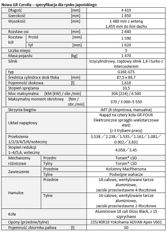 Seryjna GR Corolla otrzymała mocniejszą, 304-konną (224 kW) wersję 1,6-litrowego, rzędowego, trzycylindrowego silnika turbo z intercoolerem, znanego z GR Yarisa. Samochód został wyposażony także w pochodzący z GR Yarisa napęd na cztery koła GR-FOUR, przystosowany do specyfikacji nowego modelu. Te i inne rozwiązania składają się na samochód, który gwarantuje bezpieczeństwo i pewność nawet podczas najbardziej ekstremalnej jazdy.