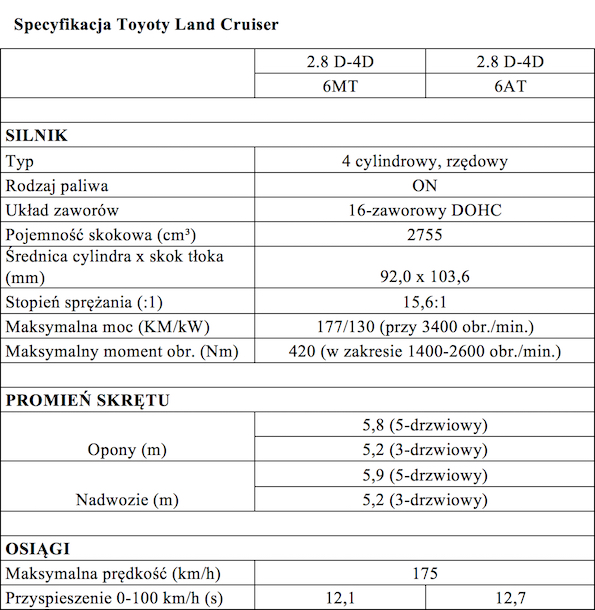 W połączeniu z 6-biegową przekładnią manualną Land Cruiser z silnikiem 2.8 D-4D dysponuje maksymalnym momentem obrotowym 420 Nm pomiędzy 1400 i 2600 obr./min. Czas przyspieszania 0–100 km/h wynosi 12,1 sekundy, a prędkość maksymalna to 175 km/h. Średnie zużycie paliwa i emisja CO2 wynoszą odpowiednio 7,4 l/100 km i 194 g/km.