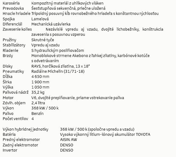 TS050 HYBRID – Technické špecifikácie: